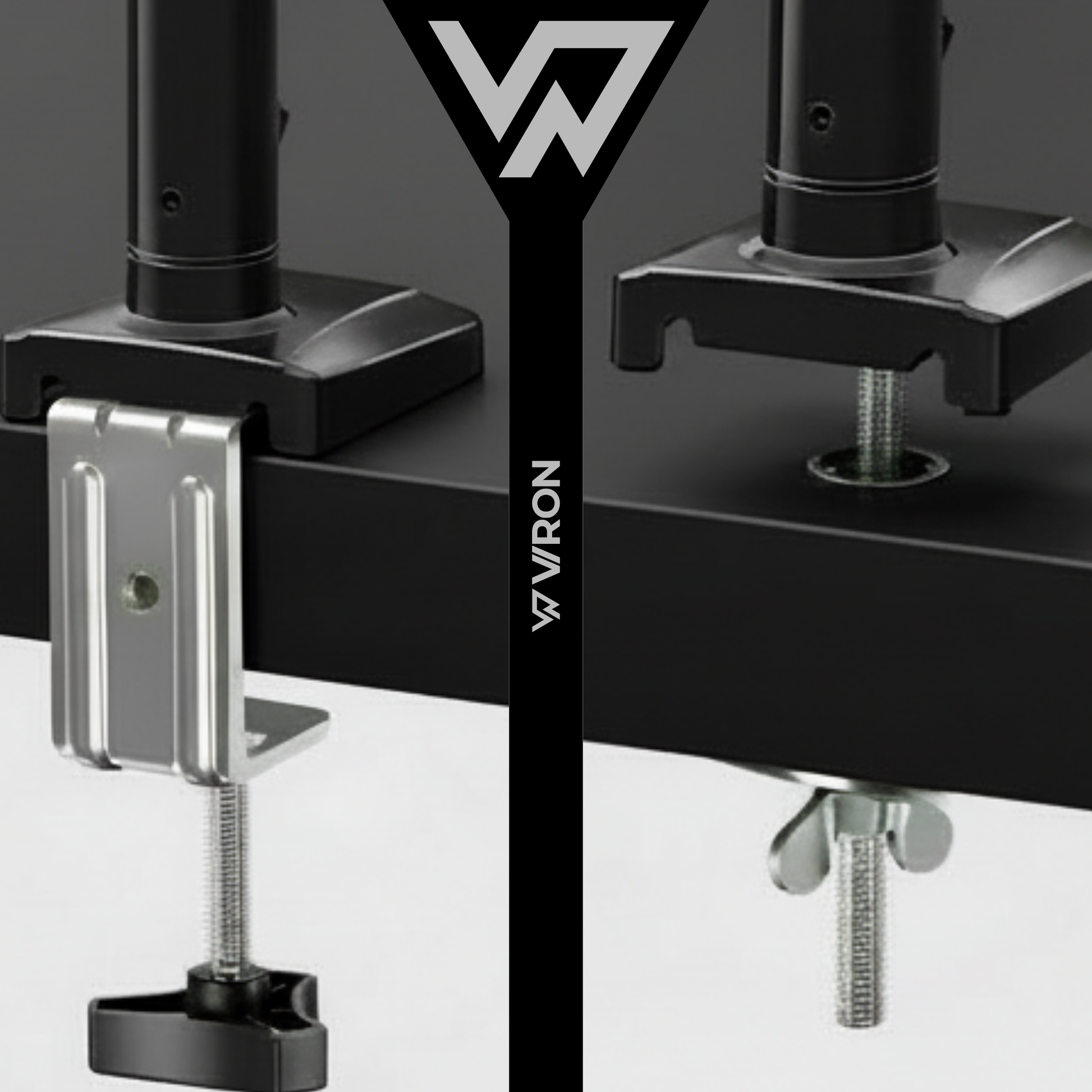 Uchwyt VIRON HX-S oferuje pełną elastyczność montażu. W zestawie znajdziesz akcesoria do instalacji za pomocą zacisku krawędziowego (bez wiercenia) oraz poprzez otwór w blacie. Dzięki temu dopasujesz go do każdego rodzaju biurka biurowego.